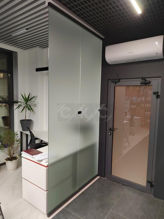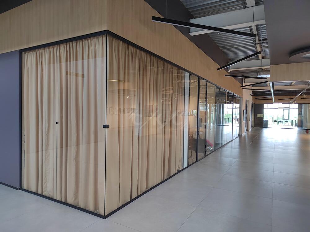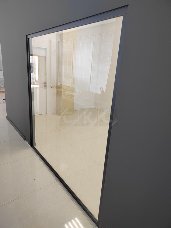 - Раздвижные цельностеклянные перегородки перемещаются по верхней направляющей и подходят для гибкого зонирования.