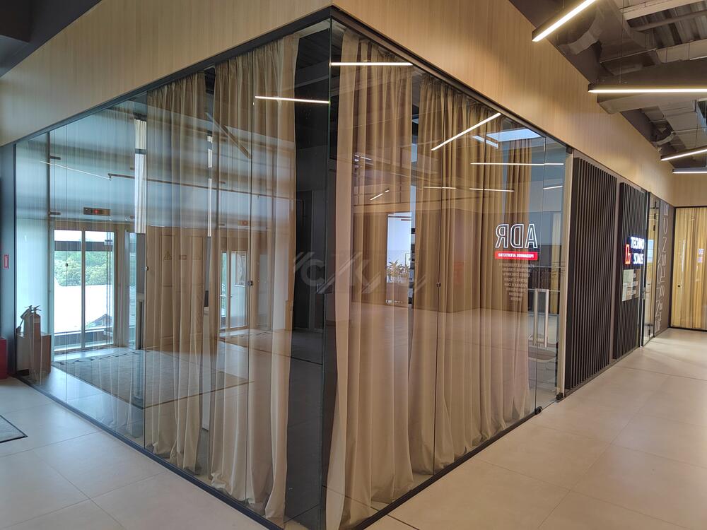Стеклянные системы без каркаса востребованы в офисных центрах, торговых комплексах, банках, салонах красоты. Цельностеклянные офисные перегородки позволяют выделить переговорную или кабинет руководителя, сохраняя визуальную связь между зонами. Раздвижные варианты особенно удобны там, где требуется быстрая трансформация помещения.